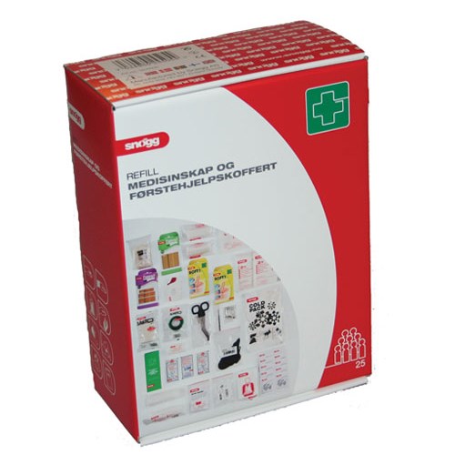Det skal være enkelt for deg å holde førstehjelpsutstyret i komplett stand. Derfor har vi i Snøgg utarbeidet en etterfyllingsenhet med alle de produktene ditt medisinskap eller din førstehjelpskoffert trenger. Produktene i denne pakken er tilpasset ulike behov. Pakken inneholder blant annet Soft 1 limfritt plaster, saks, støttebandasje, ispose og gasbind.