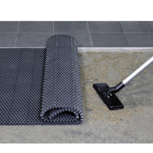 Matten rengjøres enkelt med kosting eller spyling med vann. Undersiden