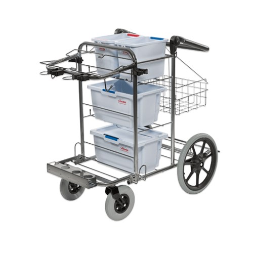 2 stk bøtter og opp til 5 stk moppe-bokser. Vognen er tilpasset til det nye tilhøret til Origo — bøtter og bokser.