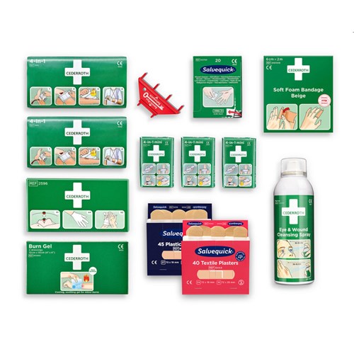 Cederroth Refillpakke til Førstehjelpstasjon (REF 51011026) Inneholder et komplett sett med refiller til stasjonen og er nå oppdatert med 1 stk. Soft Foam Bandage Beige 6cmx2m.