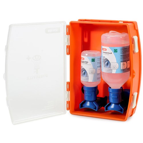 Snøgg Øyeskyllekabinett med pH Neutral. Dette er den perfekte kombinasjon ved ulykker med syrer og baser/lut.pH Neutral brukes først for effektivt å stoppe skaden som påføres øyet, og Snøgg øyeskylleflaske brukes under transport til lege. pH Neutral øyeskyllekabinett er støvtett og komplett med veggoppheng. Kabinettet kan enkelt gjøres om til en mobil enhet.