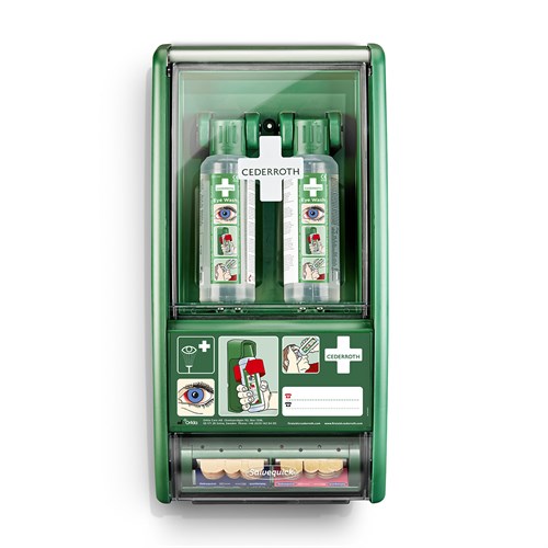 Stasjonen har plass til 2 flasker som åpnes automatisk når de vris ut av holderne. Flaskene er utformet slik at øyet får rikelig flyt av væske i ca. 1,5 minutter. 4,5 års holdbarhetstid. Bufret væske øker sjansen til å redde øynene. Cederroth Øyedusj virker ved at den nøytraliserer øyets pH-verdi, dvs. at den har en nøytraliserende effekt på sprut av alkalier og syrer, noe som gir raskere resultat