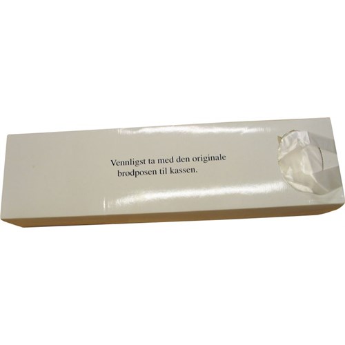 Plastpose med knyting til bruk i brødskjæremaskiner som er pakket i praktisk dispenserboks som passer i tilhørende stativ.