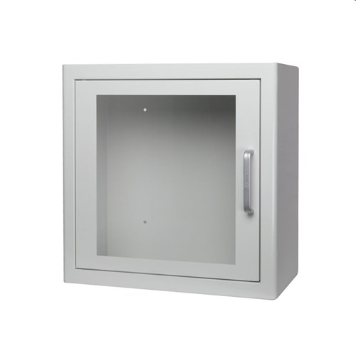 Skap til hjertestarter H: 38cm, B: 38cm, D: 20cm Veggskap til hjertestarter. Skapet har alarm som utløses når døren åpnes.