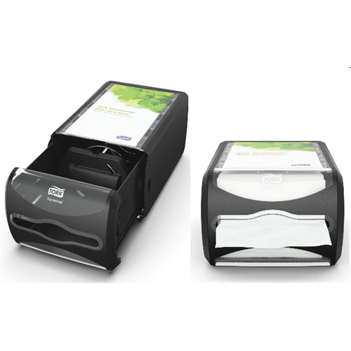 Reduserer serviettforbruk med minst 25% sammenlignet med tradisjonelle serviettdispensere. Forbedret hygiene ettersom det mates ut en og en serviett. Reklamemulighet i dispenserens vindu. Kapasitet 550 stk servietter