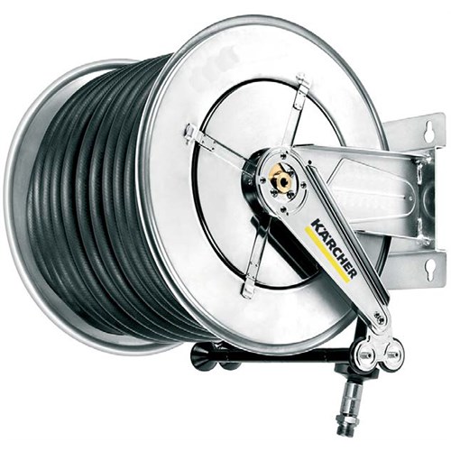 Høytrykk slangetrommel med svivel og slange 50 mtr. Rustfritt stål.