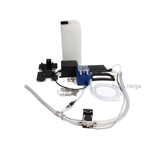 Et kjemidoseringskit monteres på gulvvaskeren og sørger for korrekt innblaning. Innblandingen skjer rett før børsten slik at kjemien ikke tærer på viktige maskindeler.