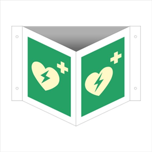 Plogskilt i etterlysende aluminium. Tosidig vinkelskilt for hjertestarter som er godt synlig på tvers av ferdselsretningen