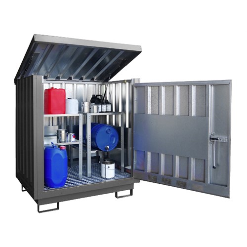 Laget i 3 mm stål for utendørs eller innendørs oppbevaring. Lakkert i grå RAL 7005. For 200 liters fat eller IBC-beholdere. Med galvanisert gitter, lastekapasitet 1000 kg/m2. Overbygd, stengt konstruksjon i galvanisert stål. Naturlig luftsirkulasjon. Låsbar og hengslet dør. Også for fat med monterte pumper og trakt. har hengsler med 2 stk gasstrykkfjærer i taket, som gjør det lett å åpne og lukke.