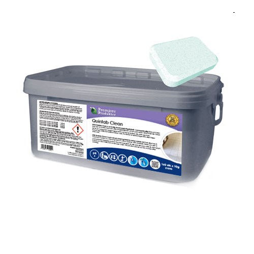 Quintab Clean er en ferdig dosert rengjøringstablett i vannoppløselig folie som løser seg opp i en bøtte med vann eller rengjøringstank på en gulvvasker.