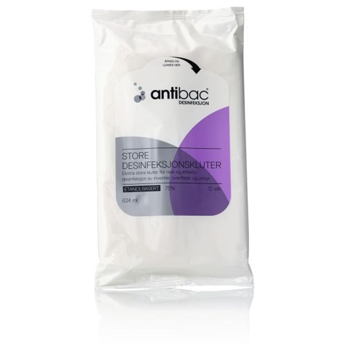 Store desinfeksjonskluter med 75% alkohol som er den perfekte løsningen for rask og effektiv desinfeksjon av store flater. Serviettene er av meget god kvalitet og er godt fuktet med sprit. Størrelsen er 24 x 40 cm x 12 i pk, og er svært solide. Objektet fuktes med spriten og skal ha en virketid på 1 min. Klutene er klare til bruk og det er ikke behov for etterbehandling. En klut rekker til hele 10 m2.
