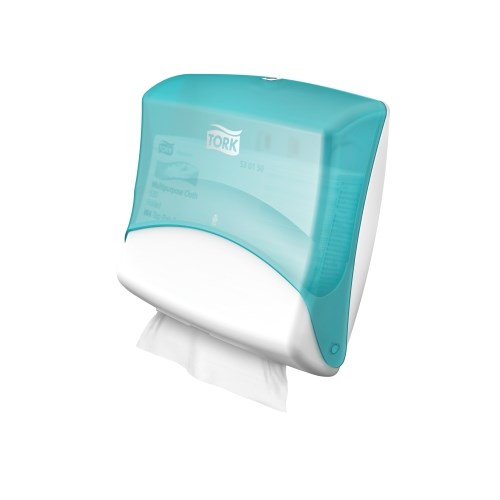 Toppdisp W4 til brettet papir hvit/turkis Tork Performance Toppholder for brettede kluter/papir. Enkel veggmontering, enkel å ta ned fra vegg. Gir god hygienisk beskyttelse, mater ut en klut av gangen, for å gi kontrollert forbruk. Perfekt egnet til bruk i hygienesensitive omgivelser, i industrien og i områder hvor det lages mat.